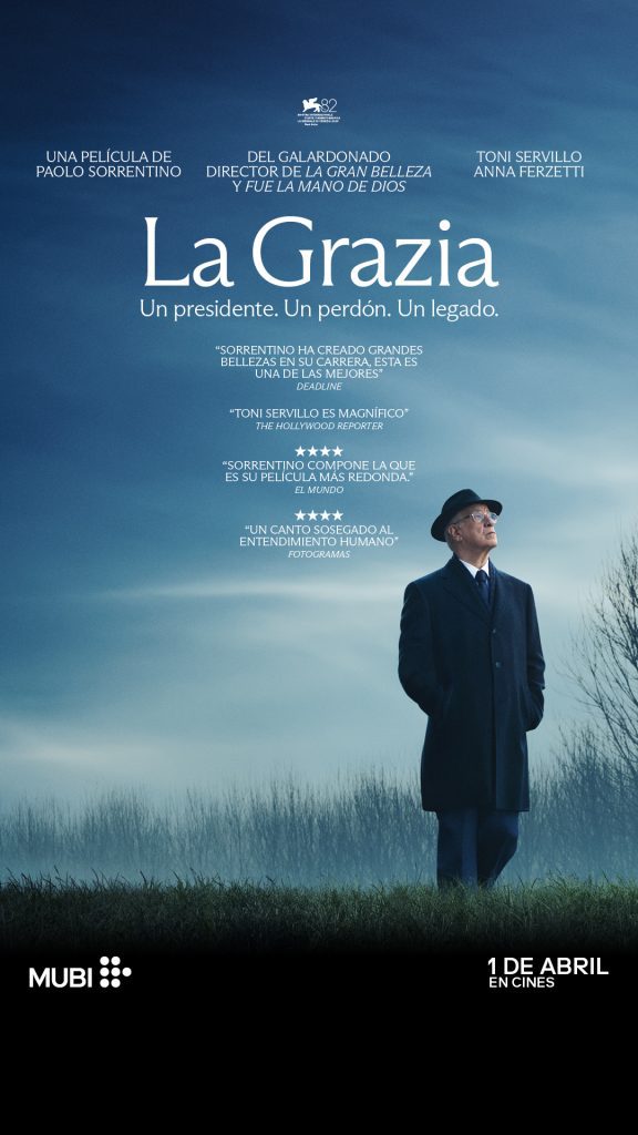 La Grazia narra los últimos días de mandato de Mariano De Santis, un Presidente de la República italiana imaginario, viudo, católico y jurista, llamado a tomar decisiones sobre delicadas solicitudes de indulto que se convierten en profundos dilemas morales entrelazados con su vida privada. A través de su mirada, la película explora el amor en todas sus formas, el valor de la duda y la responsabilidad ética del poder, especialmente en la política. Inspirada en los grandes relatos sobre los conflictos morales, la película reivindica la centralidad de la ética como fundamento de la convivencia civil y retrata a De Santis como un hombre riguroso pero íntimamente guiado por el amor y el sentido de la responsabilidad, interpretado por Toni Servillo, galardonado con la Coppa Volpi en Venecia. Estreno en España.